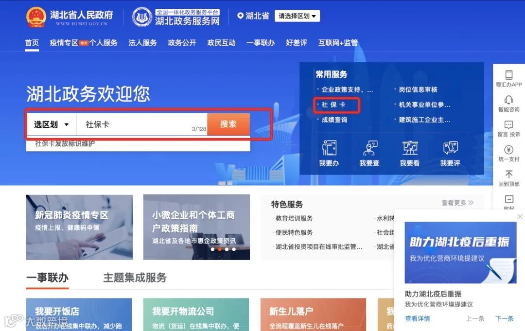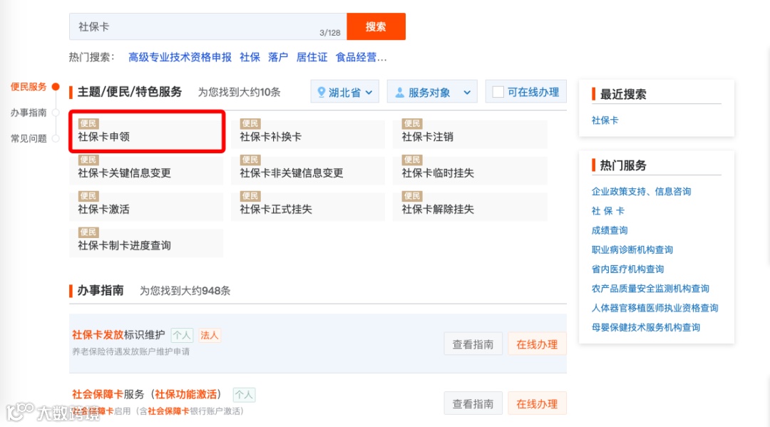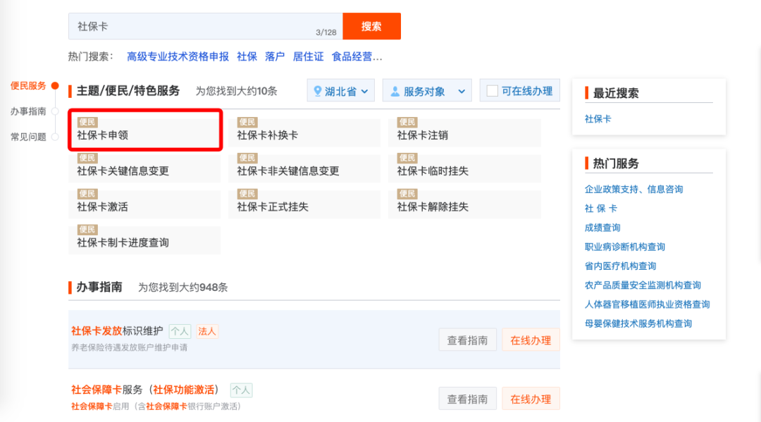 第一步:登录湖北政务服务网,搜索“社保卡”或者在常用服务中点击“社保卡”;