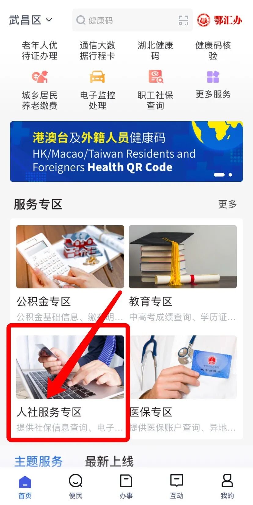 第一步:进入“鄂汇办”App,进入“人社服务专区”;