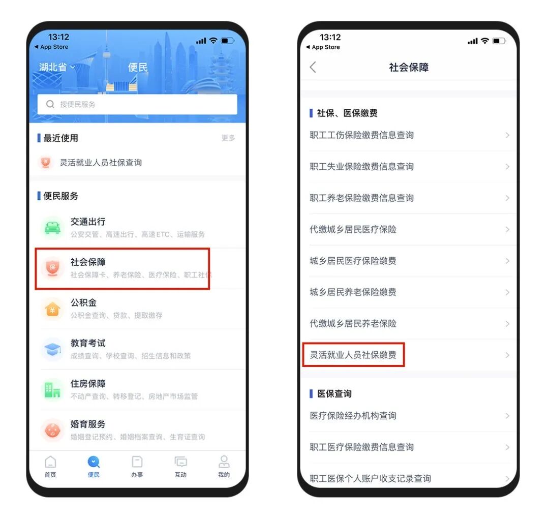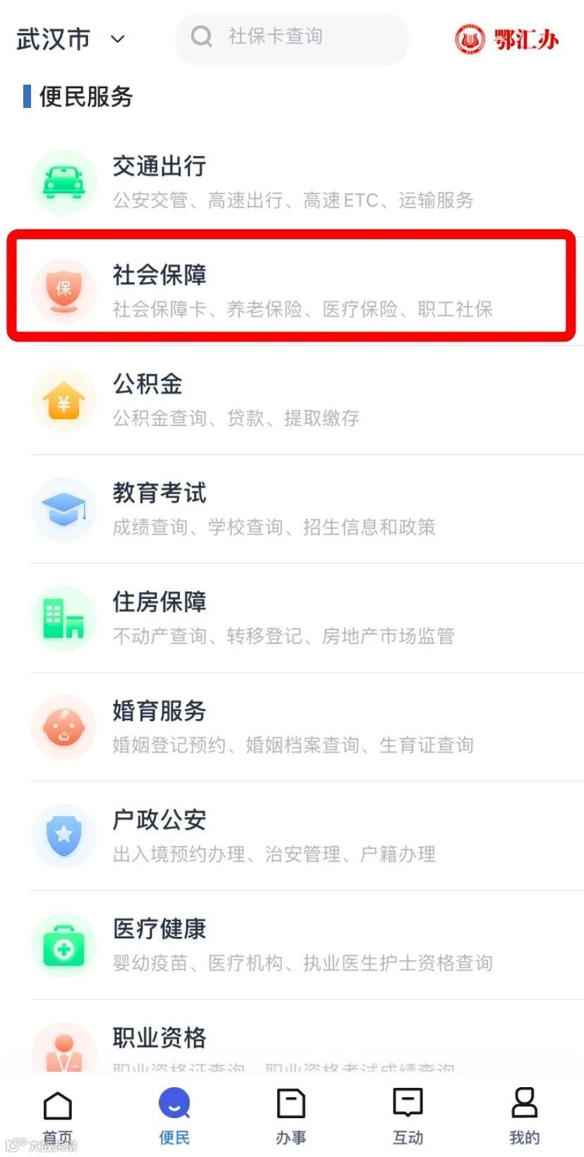 第一步:进入“鄂汇办”App,点击底部“便民”菜单栏,进入“社会保障”;