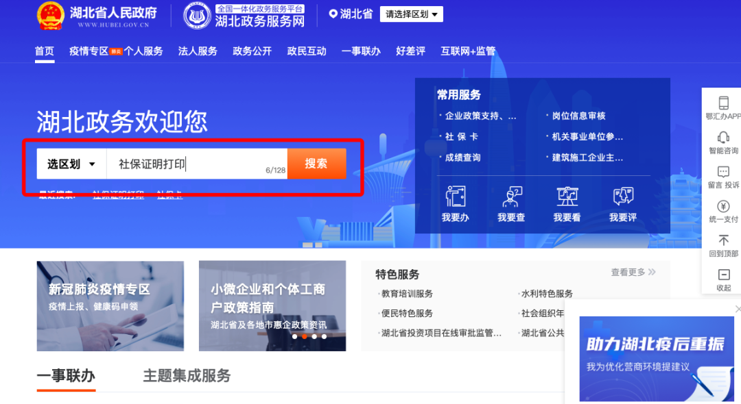 第一步:登录湖北政务服务网,搜索“社保证明打印”;