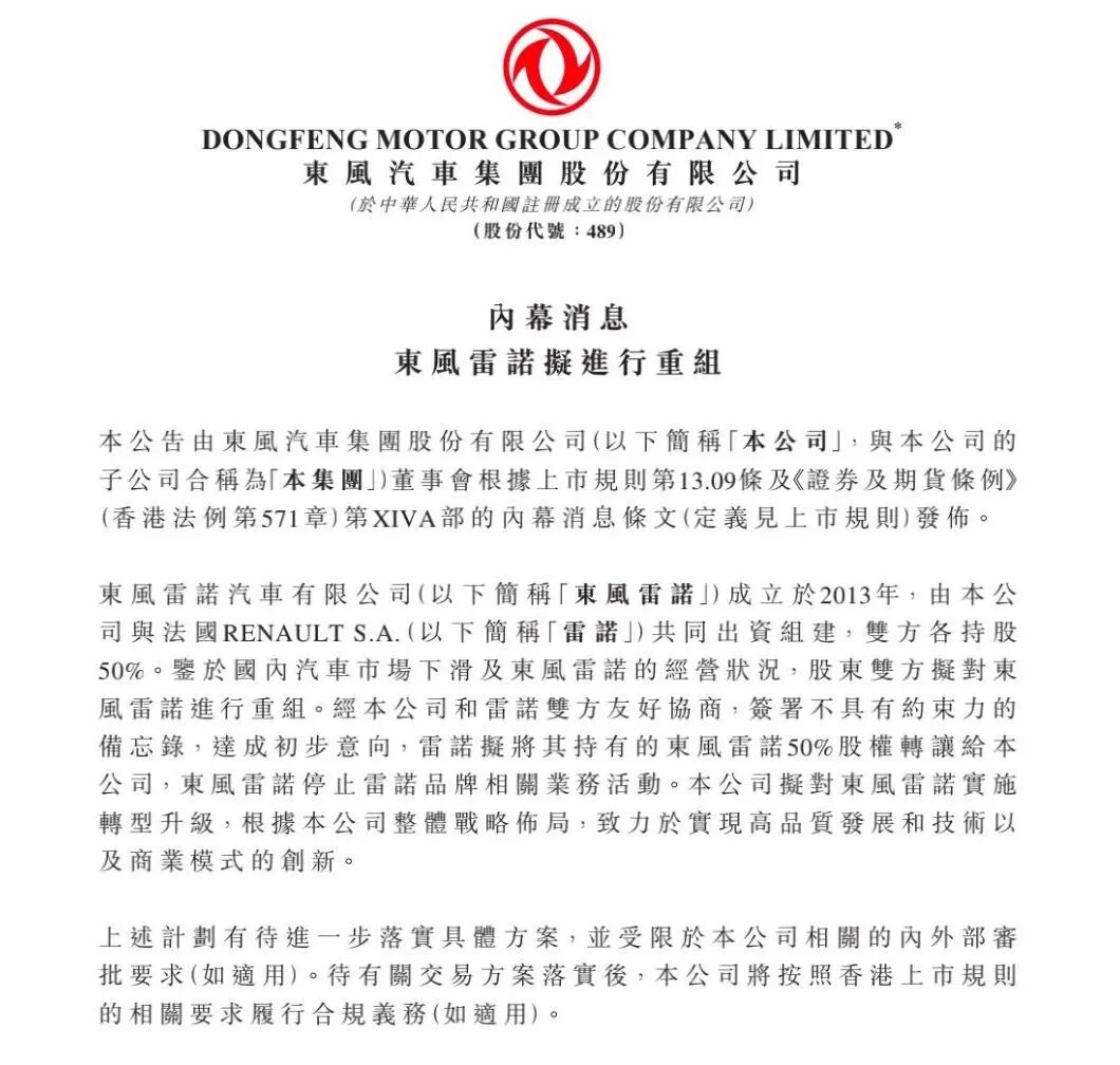 4月14日,据东风汽车最新发布的公告显示,东风汽车与法国雷诺拟将对东风雷诺进行重组,法国雷诺拟将其持有的东风雷诺50%股权转让给东风汽车,东风雷诺停止雷诺品牌相关业务活动,目前双方已经达成了初步意向,并签署了不具备约束力的备忘录。