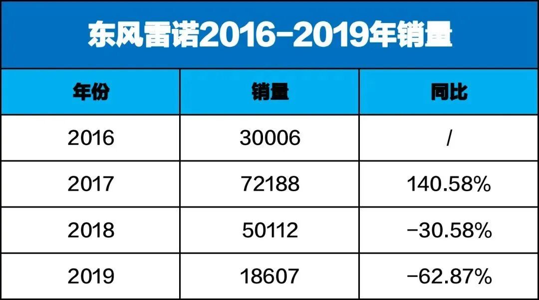 合资公司正式成立三年后,东风雷诺在2016年正式实现量产,首年销量突破了2.63万辆;在2017年,东风雷诺达到销量顶峰,全年销售6.84万辆;而在随后的两年,东风雷诺销量逐年走低,2019年销量仅为1.98万辆,同比上一年度大幅下跌61.4%。市场下行叠加疫情冲击,2020年一季度,东风雷诺销量仅为2243辆。