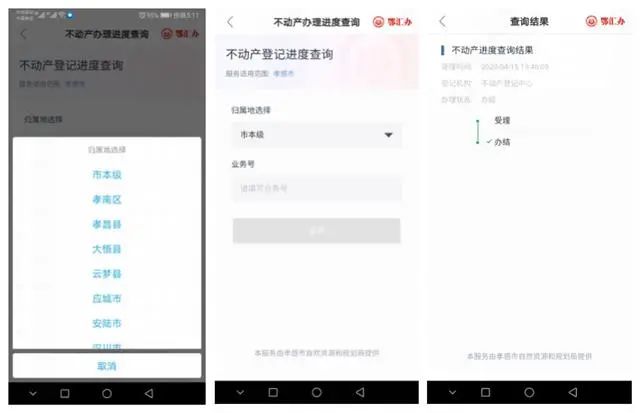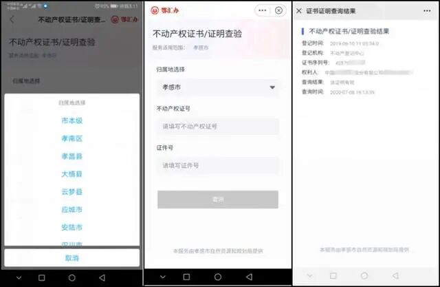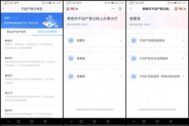 1、登录“鄂汇办”App,在页面首页服务专区点击“更多”,在不动产登记专区选择“地市州不动产服务”,根据区域选择“孝感市”,通过鄂汇办人脸识别认证进入不动产网上登记中心通过“我要查”板块进行网上自助查询。