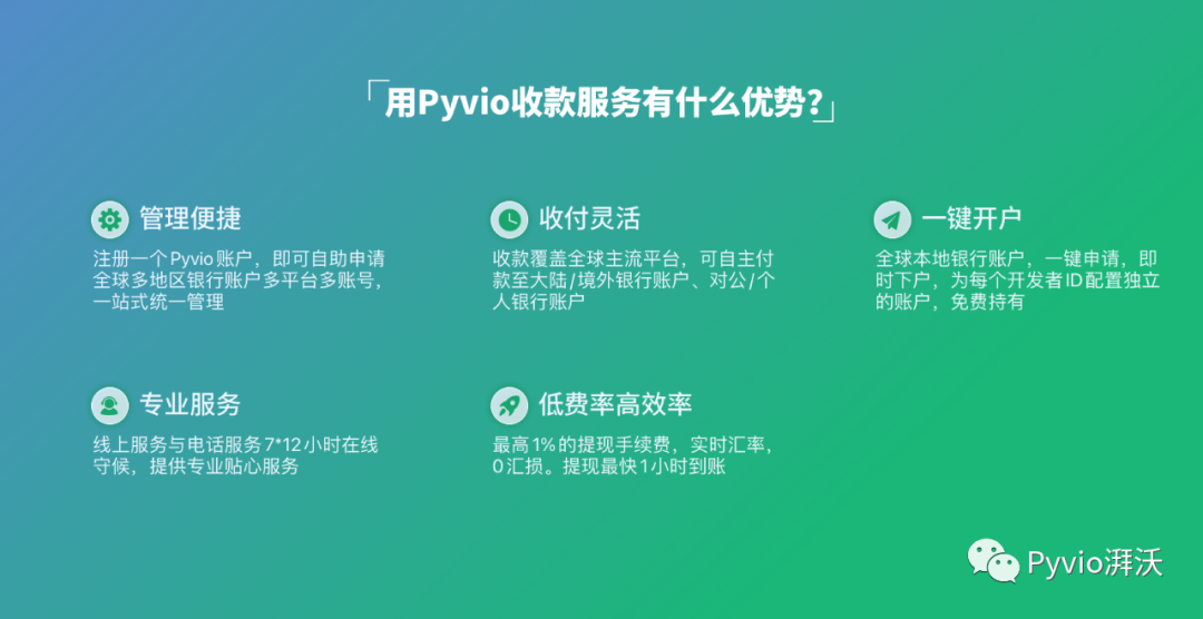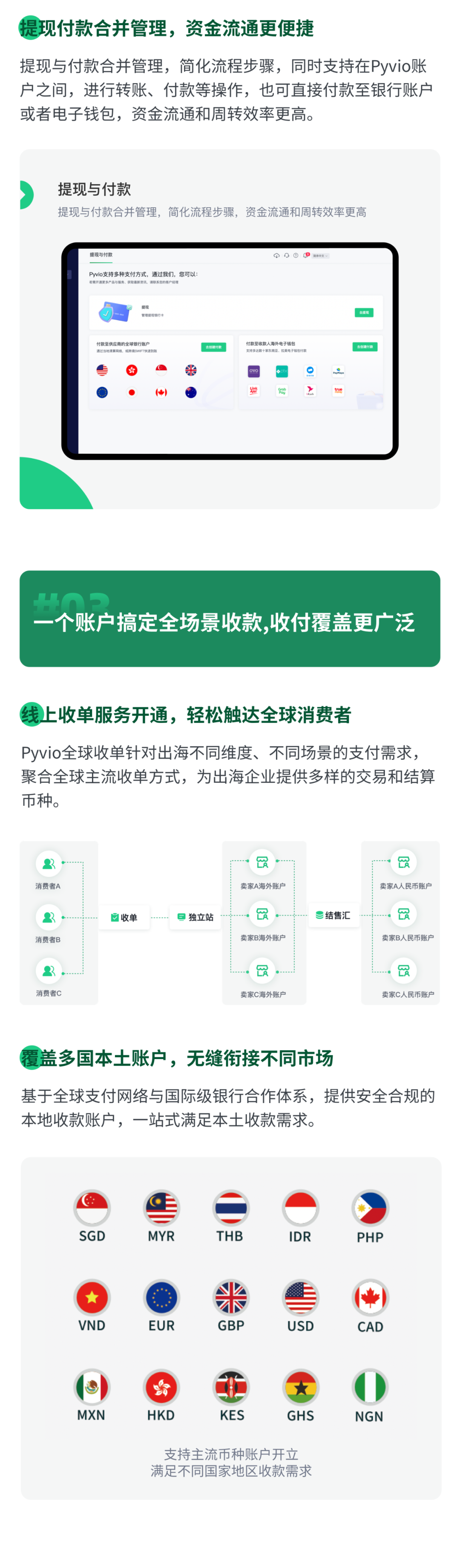 Pyvio(湃沃)是一家全球金融科技公司,专注于构建全球本地化金融服务基础设施,帮助跨境企业实现全球资金高效运转。主要业务涵盖跨境电商平台收款,B2B贸易收款,东南亚本土店铺收款,出海游戏与工具类App收款,全球分发,海外企业注册等。