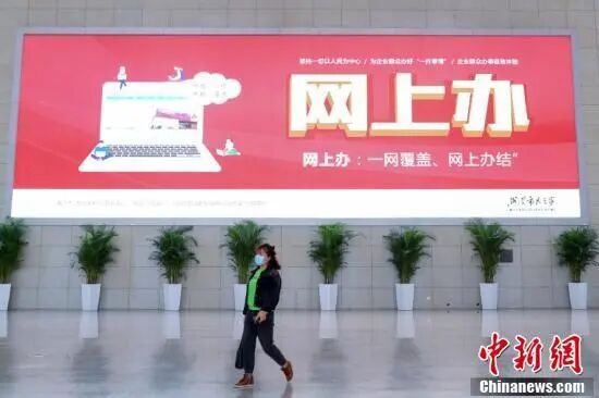 ▲ 政务大厅内一位市民从的显示着“网上办”字样大屏前走过
