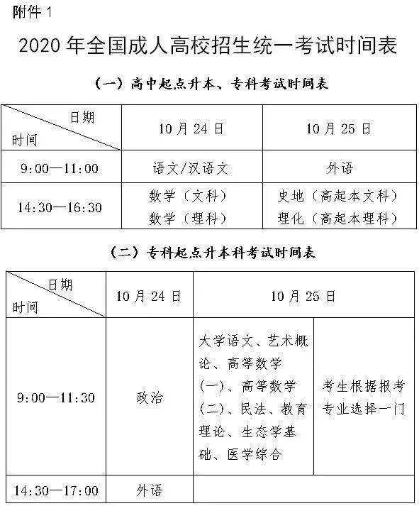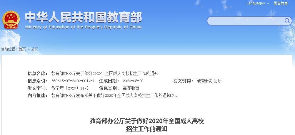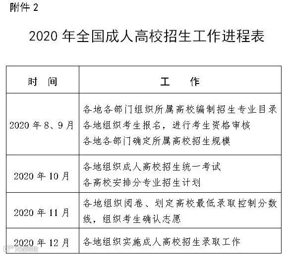 8月28日,教育部网站发布《教育部办公厅关于做好2020年全国成人高校招生工作的通知》,通知称,2020年全国成人高考安排在10月24日至25日。