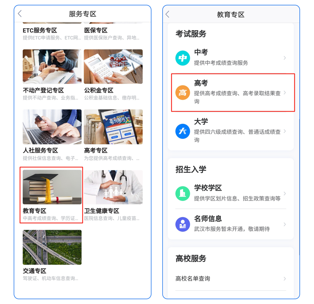 1. 打开鄂汇办APP,点击服务专区—更多进入教育专区,选择考试服务—高考;