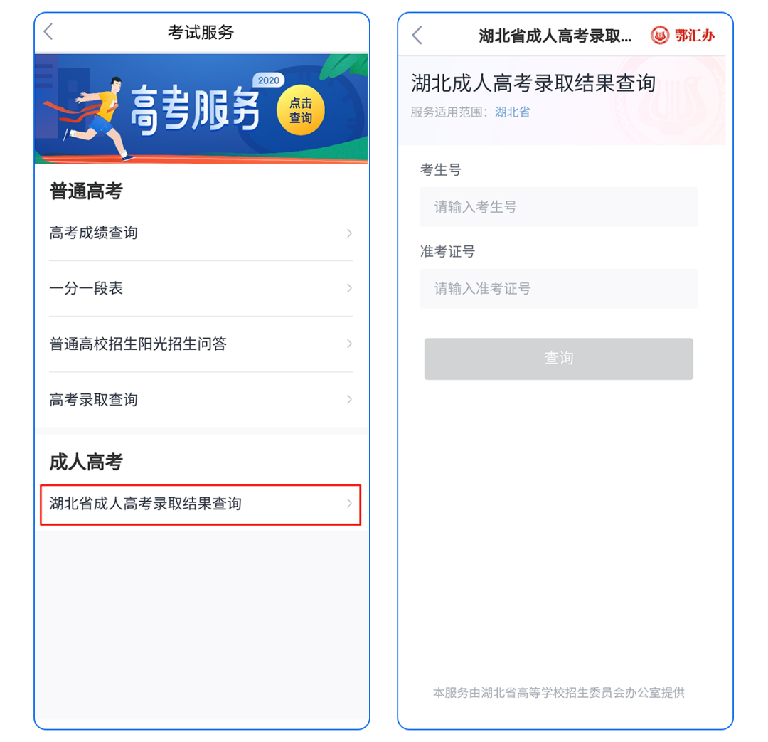 2.选择湖北省成人高考录取结果查询,输入考生号、准考证号即可进行查询。