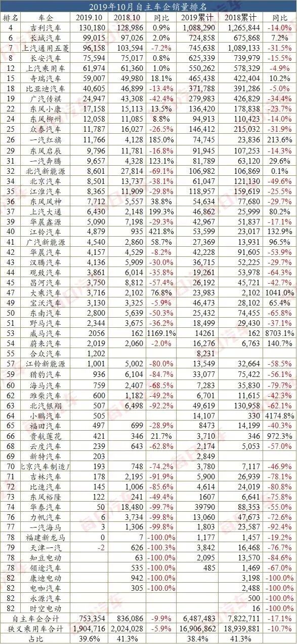 同时,中国品牌乘用车市场份额持续下降,市场占率已跌破40%红线。中汽协数据显示,2019年1-10月中国品牌乘用车共销售667.2万辆,同比下降17.5%,占乘用车销售总量的38.9%,比上年同期下降3.1个百分点。市场和消费环境的变化,以及合资品牌价格下探,让中国品牌生存空间受到挤压。