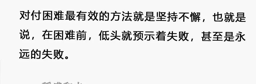 对付困难最有效的方法就是坚持不懈,也就是说,在困难前,低头就预示着失败,甚至是永远的失败。
