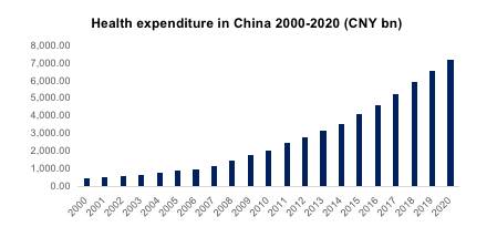 China’s government health expenditure has more than tripled since health reforms began in 2009. In 2020, the total expenditure on health care in China reached over CNY 7.2 trillion, representing around 7% of the GDP, still far below the OECD average of 12.5% and 16.7% in US.