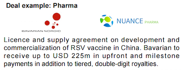 For the exclusive China license, the Chinese company pays the Nordic company (1) an upfront payment (2) a fixed percent of the revenues in royalty, or a combination
