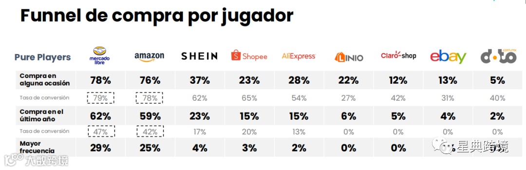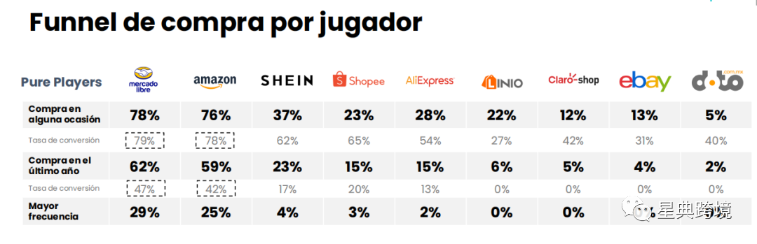 报告还显示,墨西哥网购率最高的产品和服务类别有:外卖、时尚类、美容及个人护理类、玩具类、电子产品/文化产品类。在墨西哥零售电商市场中,主导平台有亚马逊、美客多、沃尔玛,这三个平台占据当地市场最大的份额,亚马逊和美客多是墨西哥月均流量最高的两大平台,对当地的投资也在不断加大。SHEIN在当地也占据了非常不错的市场份额,且目前依旧保持着增速状态。