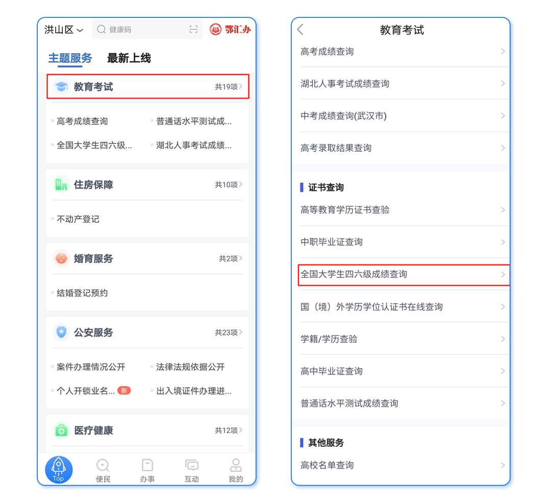 第一步:打开鄂汇办APP,下滑至主题服务—教育考试,选择证书查询中的全国大学生四六级成绩查询进入;