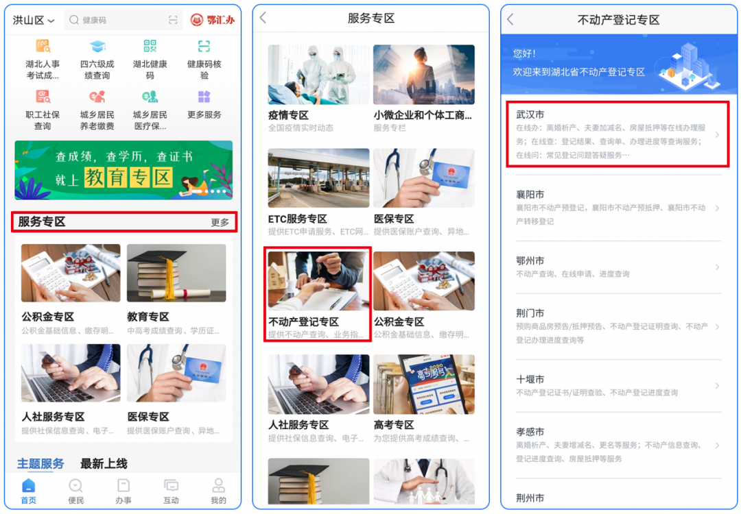 1. 打开鄂汇办APP,点击服务专区—更多,选择不动产登记专区,点击武汉市进入;