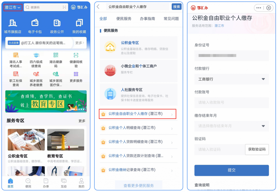 以公积金自由职业个人缴存为例,打开鄂汇办APP,定位选择潜江市,在首页搜索框中搜索公积金自由职业个人缴存,即弹出潜江市公积金相关功能,选择公积金自由职业个人缴存(潜江市)进入,填写付款账号、缴存结束年月、验证码后进行提交即可。