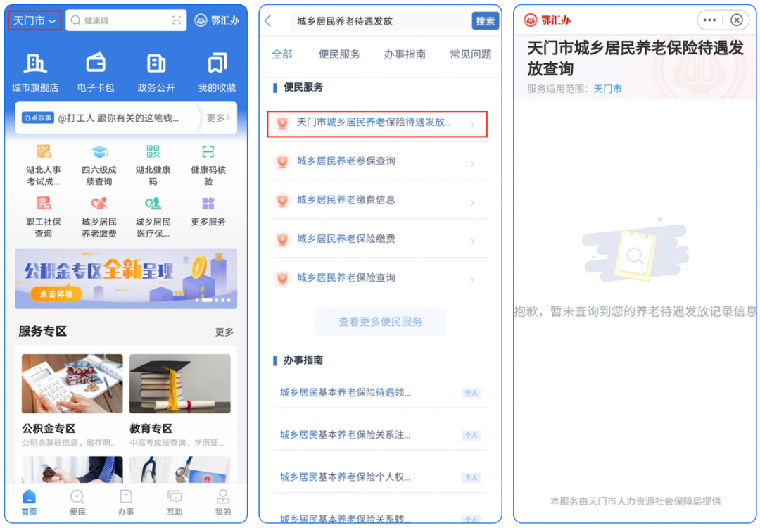 以城乡居民养老保险待遇发放查询为例,打开鄂汇办APP,定位选择天门市,在首页搜索框中搜索城乡居民养老保险待遇发放查询,选择城乡居民养老保险待遇发放查询(天门市)进入,进行服务后即可查询待遇发放明细。