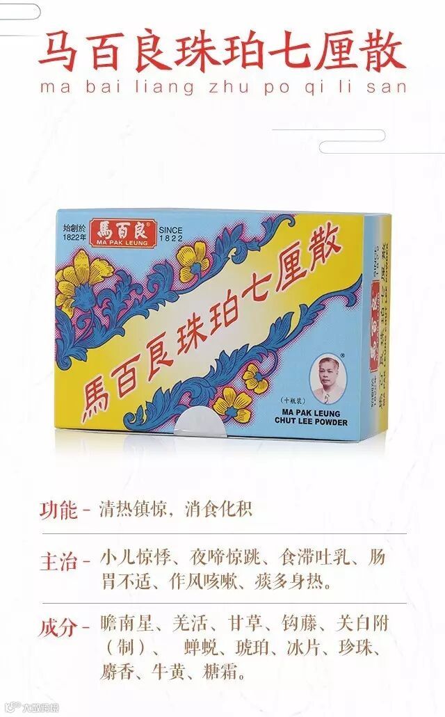 珠珀七厘散乃本药厂始创炼制之儿科良药,已畅销一百七十多年,除选用名贵珍珠,琥珀,尚有十多种上等药材研制而成,每瓶重,为量七厘重,故名“珠珀七厘散”。药粉特别幼滑,最适合婴儿肠胃服用,绝对安全可靠,为保障婴儿健康,购买时请认明“马百良珠珀七厘散”才可以购买。