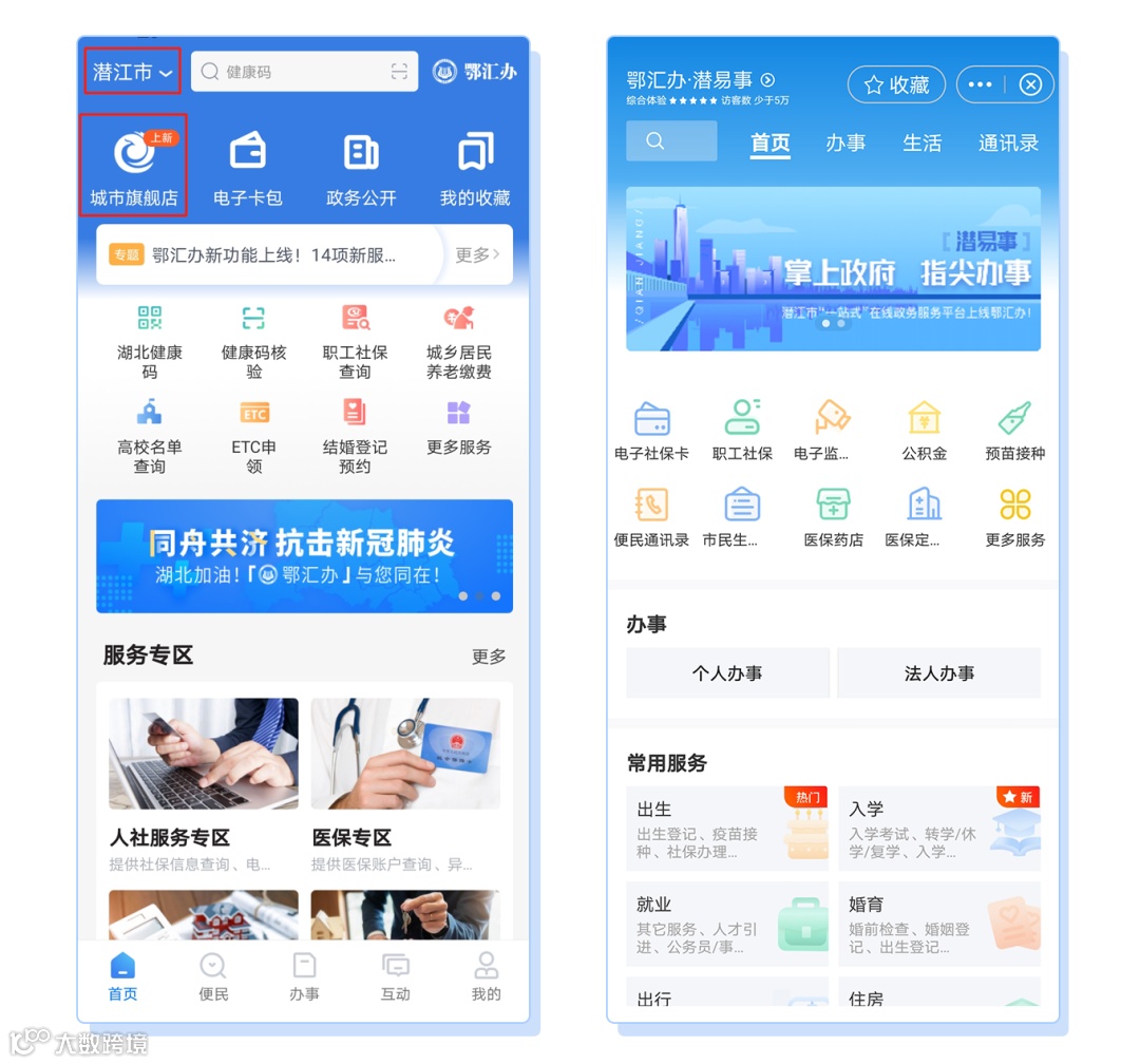 1. 打开鄂汇办APP,将定位更改为潜江市,即可选择首页头部的城市旗舰店进入。