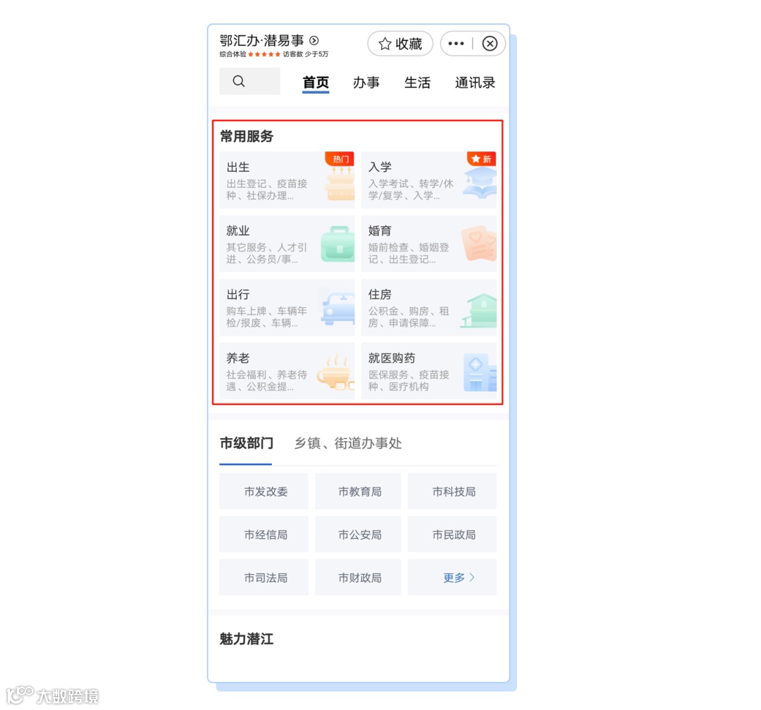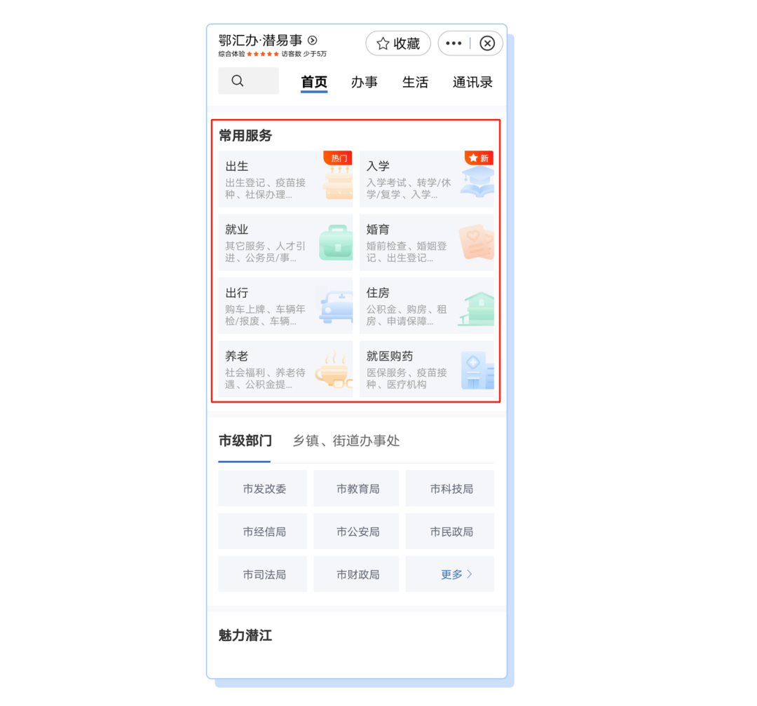 同时突出用户需求导向,设立生活服务、通讯录等板块,提供医院诊所、公交站、公厕等位置查询,聚合公积金、社保政策、公租房办理流程、社会救助标准、电话号码等信息主题,实现“一键”快速办理。目前,已有112个便民服务应用可在鄂汇办·潜江旗舰店实现“一键速办”。试运行期间,便民服务事项已累计查询1万余次。
