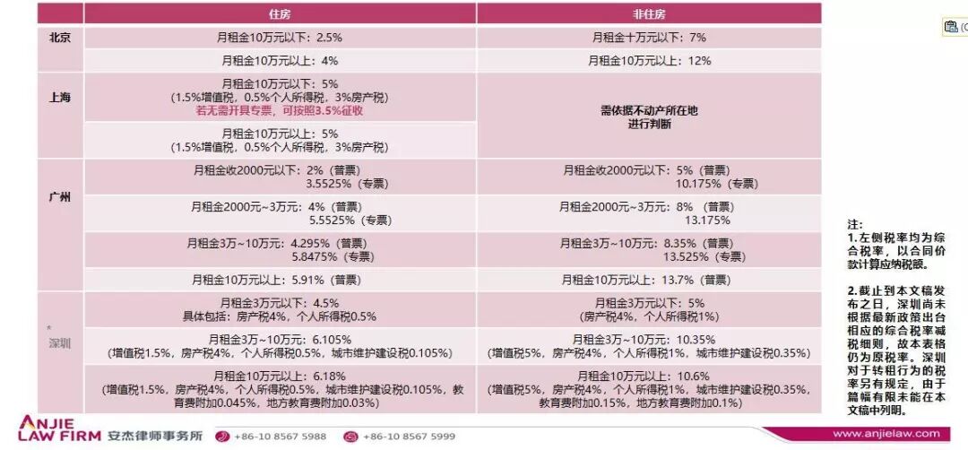 关于增值税的问题,仅知道一个计算公式其实并没有太多实际意义,因为个人取得租金收入如果在租赁期间进行平均分摊不超过一定数额的,可比照小微企业享受免征增值税的优惠政策;房产税对于个人来说是一个稍微陌生的词汇,甚至有很多人把它跟“房地产税开征”经常搞混,这是因为《中华人民共和国房产税暂行条例》第五条规定了“个人所有非营业用房产免纳房产税”,但如果是个人出租房屋,视用途不同可对租金收入征收4%或12%的房产税(关于房产税的计税依据有从价计征和从租计征两种方式,本文将不对此展开过多讨论。)房屋租金的个人所得税原则上来说应按“财产租赁所得”项目计算缴纳,税率为20%。以上都是原则规定,个人出租房屋的具体征税规定还要看各个地方,往往有各种简化和优惠政策,我们简单为大家总结了以下北上广深目前的情况仅供参考: