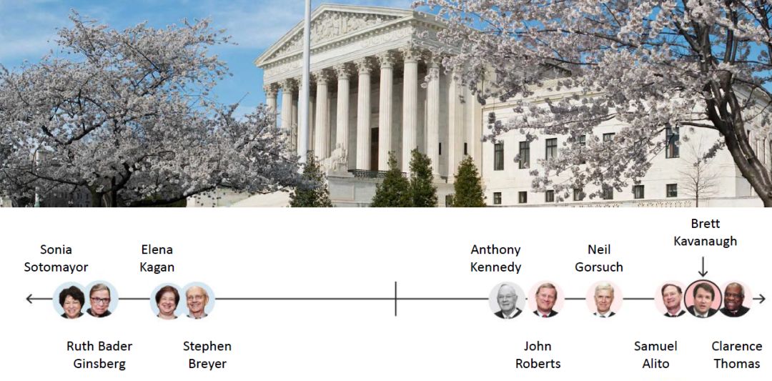 最高法院的九位大法官可以简单分为两大派系,左是自由派,右是保守派。在本次卡瓦诺任命之前,最高法院自由派和保守派是4:4的对比,定局常常要看著名的摇摆票安东尼·肯尼迪大法官如何定夺、会否临阵倒戈。安东尼·肯尼迪大法官今年6月份请辞,于是特朗普有了千载难逢的提名接替人选的机会,从而牢牢地锚定最高院的“五票”!由根正苗红的保守派卡瓦诺接替摇摆票,最高院会形成稳定的5:4保守派占据多数的局面。