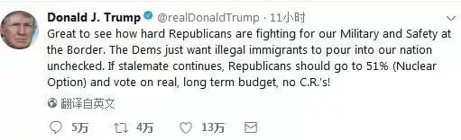 对于此次事件的发生,特朗普自然是不高兴的。21日,白宫呼吁参议院共和党人改变国会规则,特朗普更是发推特呼吁参议院多数党领袖麦康奈尔援引所谓的“核选项”,即51%的简单多数来改变如今的僵局。(参议院通过法案需要60票,但共和党只有51票,因此白宫呼吁修改规则,采用简单多数决,消除民主党的作用)