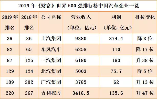 上汽集团排名第39位,其去年排名第36位,下降3位,2018年营收约为1363.9亿美元(约合人民币9380亿元),同比增长近6%;利润约为54.4亿美元(约合人民币374.4亿元),同比增长近7%。
