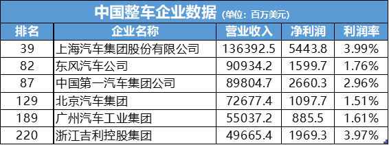 与去年相比,上榜的中国汽车企业依然是上汽集团、东风汽车、一汽集团、北汽集团、广汽集团、吉利控股6家。在这6家车企排序中,一汽集团与北汽集团互换了位置。而一汽集团、广汽集团、吉利控股分别上升了38位、13位、47位。其中,6家车企的营收指标同比都有所增长;上汽集团、东风汽车、吉利控股的利润有所增长,一汽集团、北汽集团、广汽集团的利润有所减少。