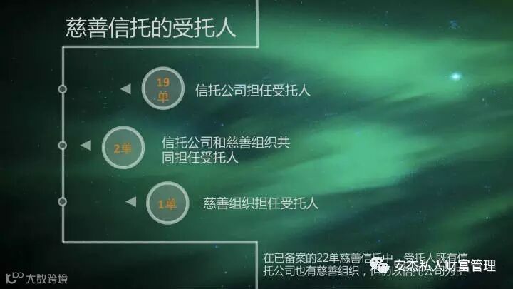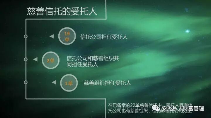 在已备案的22单慈善信托中,信托公司担任受托人的有19单,慈善组织担任受托人的有1单,以信托公司和慈善组织共同担任受托人的有2单。