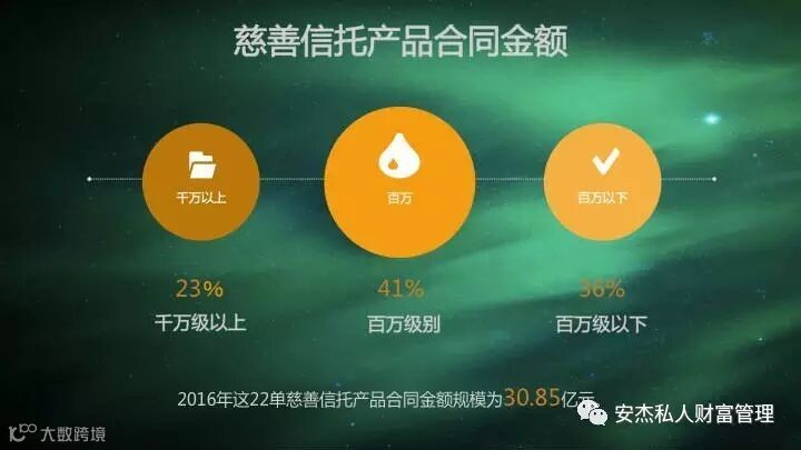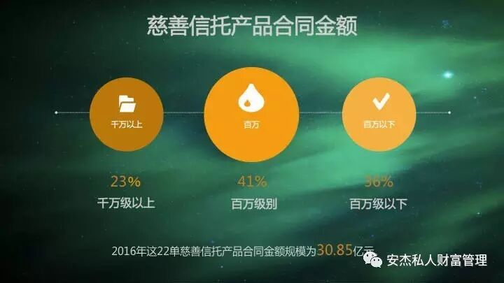 从合同金额来看,2016年这22单慈善信托产品合同金额规模为30.85亿元。其中,千万元以上的占23%,百万级别的占41%,百万元以下的占36%。