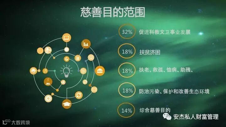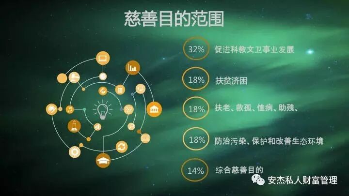 从慈善目的范围来看,2016年备案的22单慈善信托的慈善目的范围广阔,具有开放性的特点。慈善信托的慈善目的已经从救灾、扶贫、医疗等传统慈善领域向教育、环保、科技等更广泛的领域发展,符合慈善事业范围不断扩展的趋势。