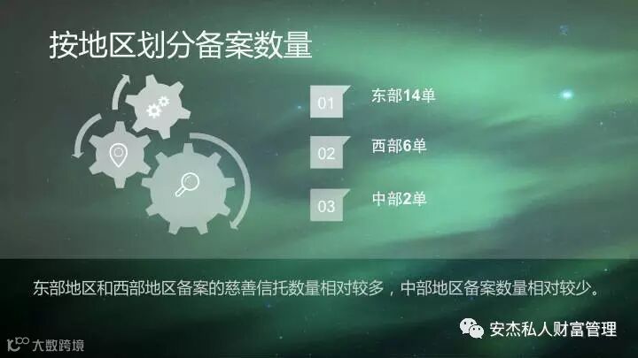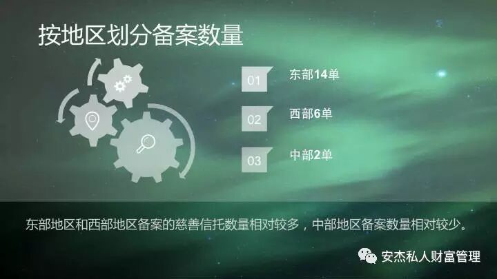 2016年全国共有12个省(直辖市)开展了慈善信托备案工作。从备案地域来看,我国东、中、西部地区均有设立慈善信托,其中,东部完成的备案最多,达14单。
