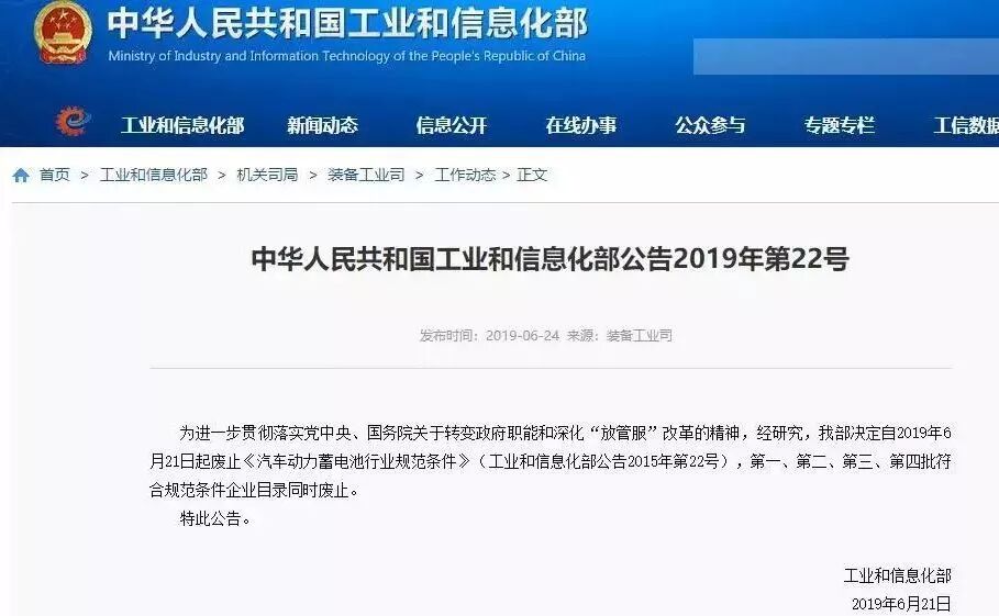 6月24日,工信部发布公告,决定自2019年6月21日起,正式废止《汽车动力蓄电池行业规范条件》(以下简称《规范条件》),第一、第二、第三、第四批符合规范条件企业目录同时废止。