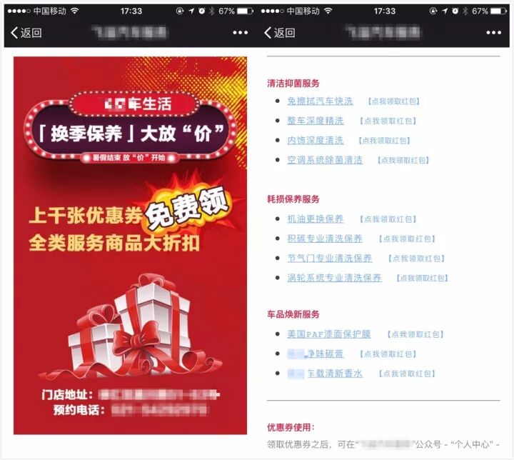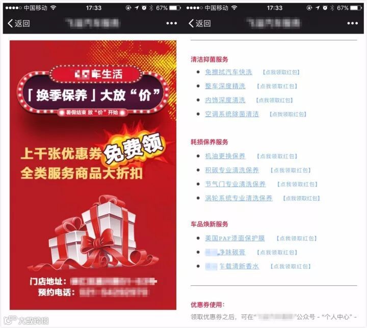 用户在优惠的驱使下到店消费,结账时店员以洗车优惠抵用券作为奖励促使客户将领取优惠券的图文转发朋友圈,达到快速循环扩散的效果;