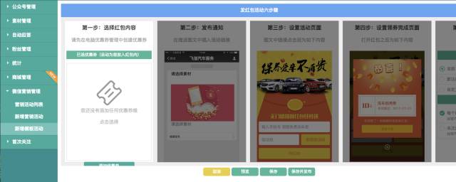 在微信托管后台制作“发红包”的优惠活动,简单四步就能让客户在推送图文里按需求领取到不同的优惠券;