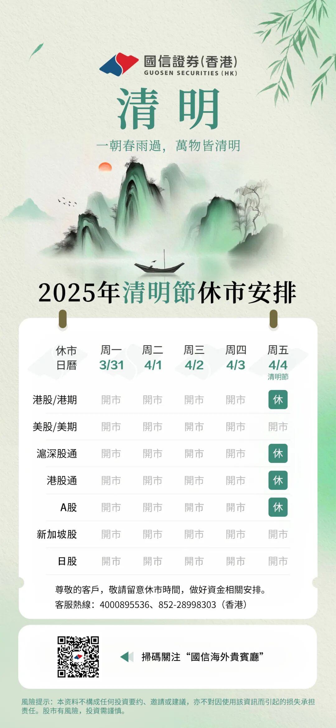 明节假期休市安排如下,敬请留意,并请提前做好交易和资金相关安排。