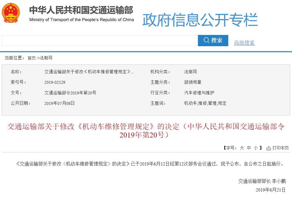 据悉,新规已于6月12日经由交通运输部内部会议通过,自公布之日起施行。此次是交通运输部对《机动车维修管理规定》进行的第三次修改,涉及34项,旨在对机动车维修经营进行更为规范的要求,助推行业形成市场化运营机制,从而鼓励连锁型维修企业合规发展,促进推动行业良性健康发展。