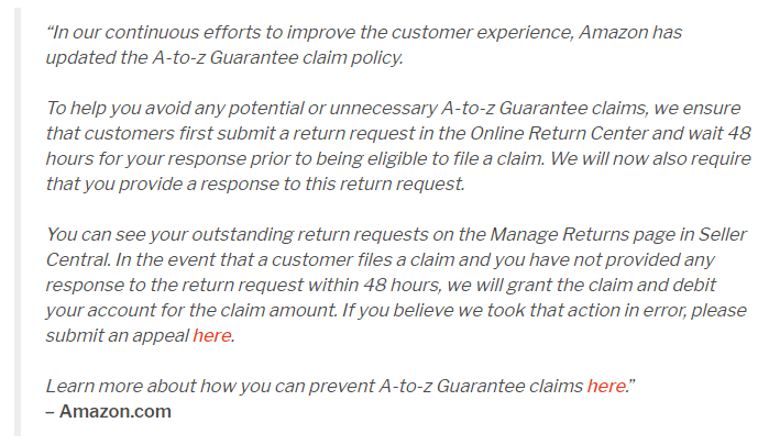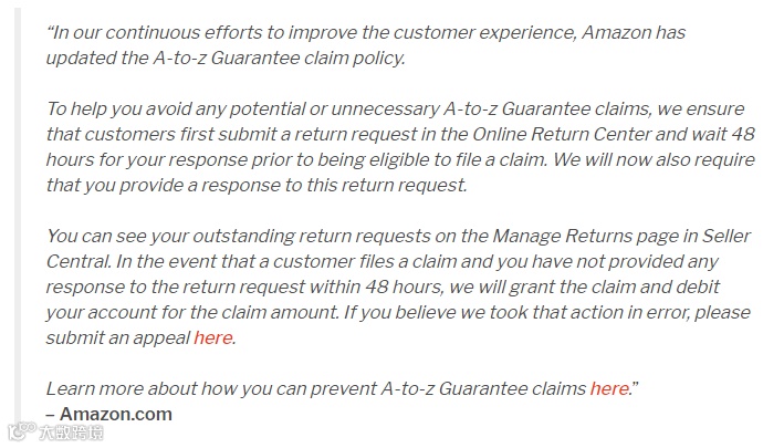 为了帮助您避免任何潜在的或不必要的A-to-Z担保索赔,我们确保客户首先在在线退货中心提交退货请求,并等待48小时以得到您的答复,然后才有资格提出索赔。