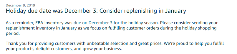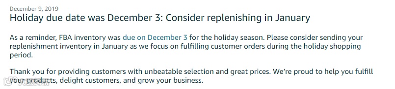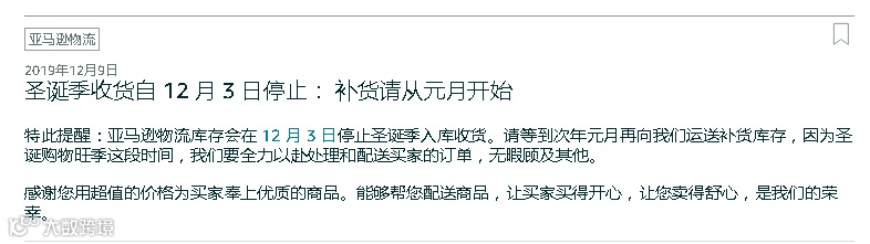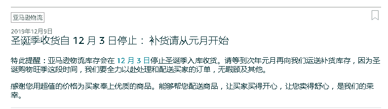 通知显示,亚马逊物流库存会在 12 月 3 日停止圣诞季入库收货。请卖家等到次年元月再向亚马逊运送补货库存,因为圣诞购物旺季这段时间,亚马逊要全力以赴处理和配送买家的订单,无暇顾及其他。