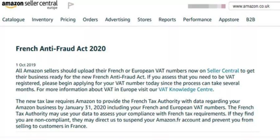 前段时间亚马逊刚刚邮件通知了法国等站点的卖家,“虽然法国最近对VAT的法规尚且不明确,但是我们仍然强烈建议卖家提前准备好法国,意大利等国家的VAT税号并上传”