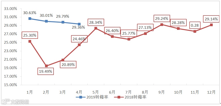 4月份二手车转籍总量为35.25万辆,转籍比例为29.36%,与去年同期相比增长了4.9个百分点。