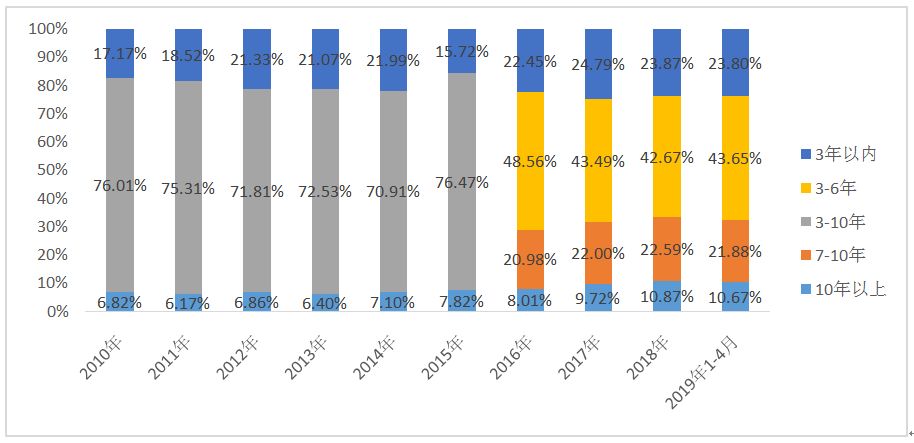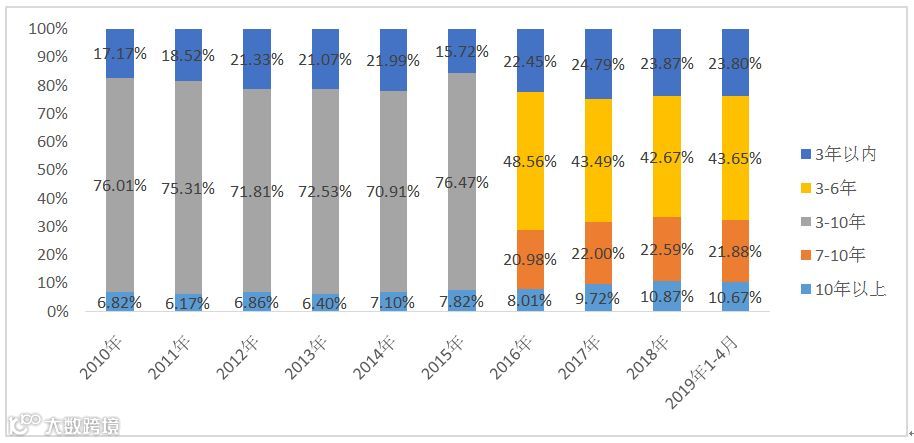 2019年1-4月,使用年限在3-6年的二手车交易量最多,占比为43.65%,其次是3年内为23.8% 。