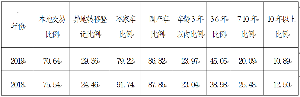 可以看到车龄在6年以内的车型占了总交易量的69.02%。另外,车龄在10年以上的车型比例与去年同期相比有小幅度下降,2019年4月共实现交易13.07万辆。