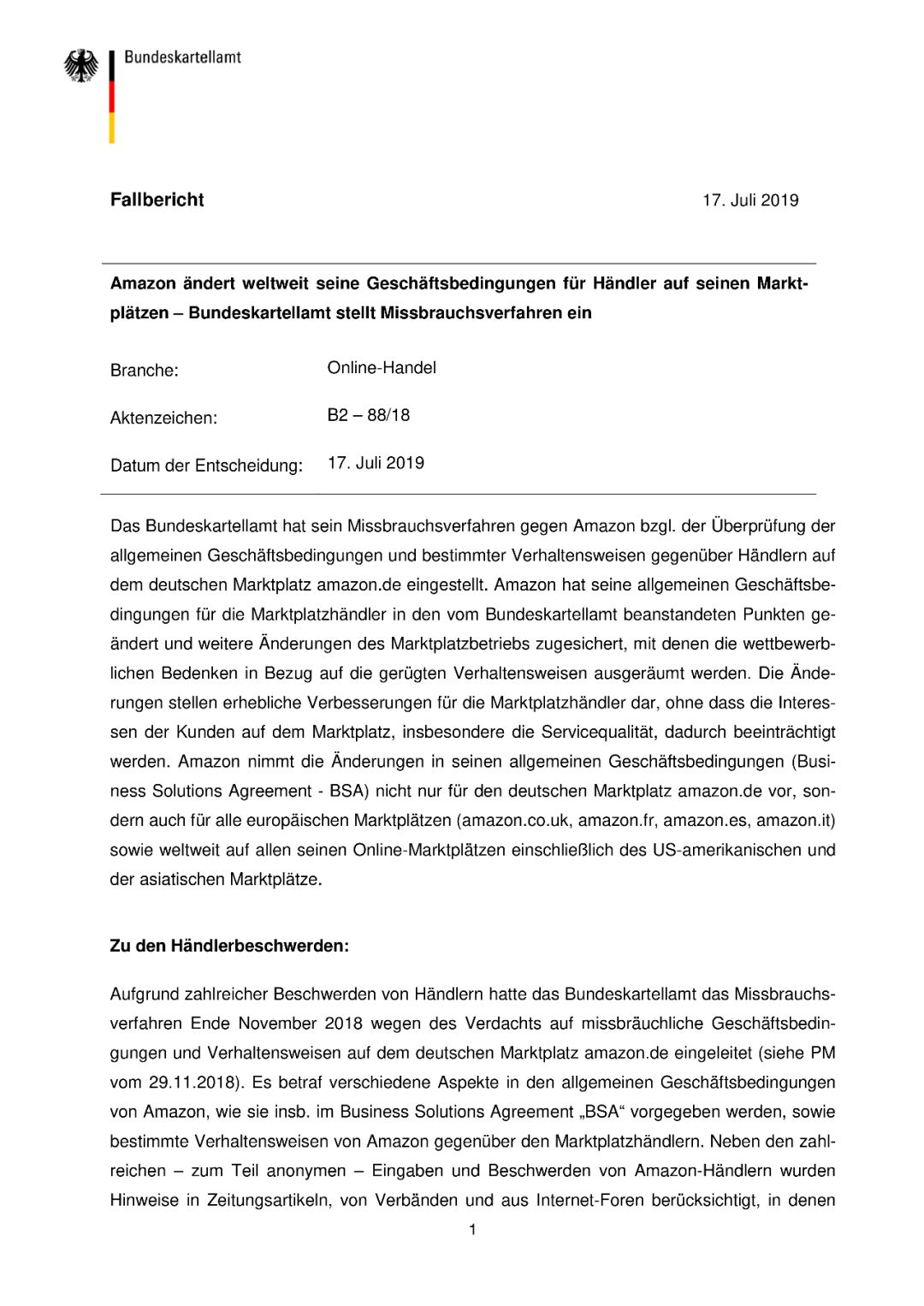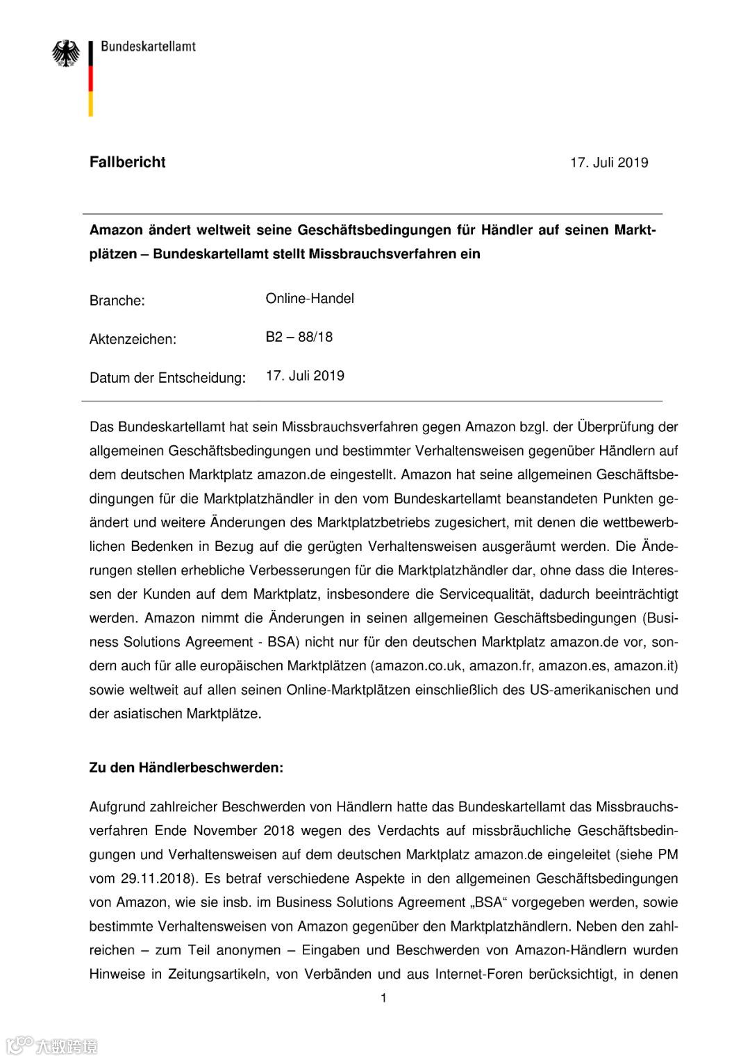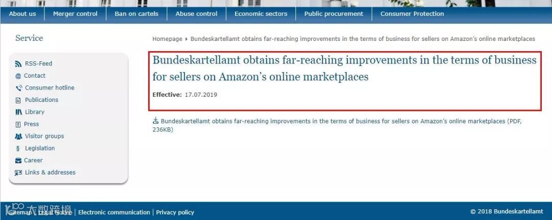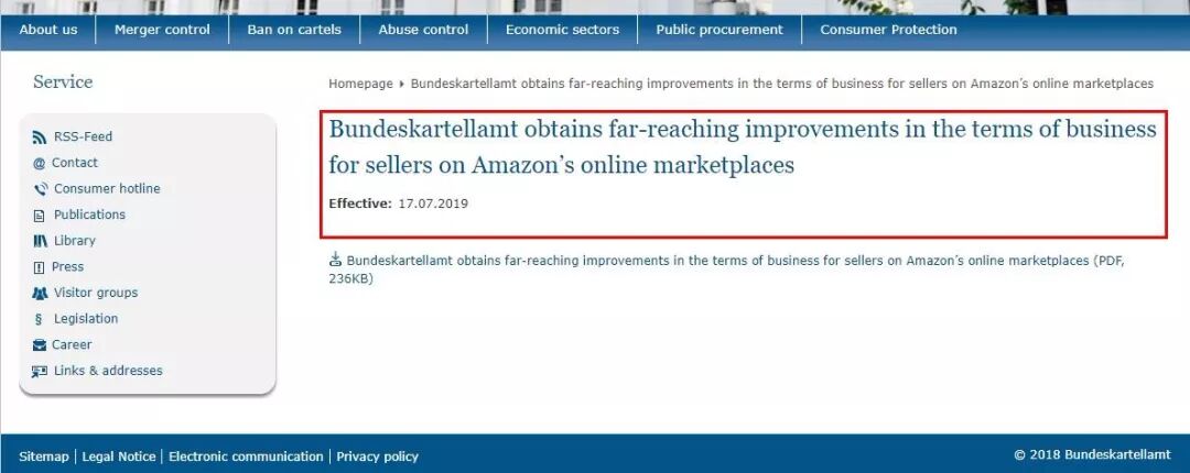 当地时间7月17日,德国Bundeskartellamt(联邦卡特尔办公室)发布文件,主题为:我们为亚马逊的第三方卖家的商业条款带来了深远的改善。