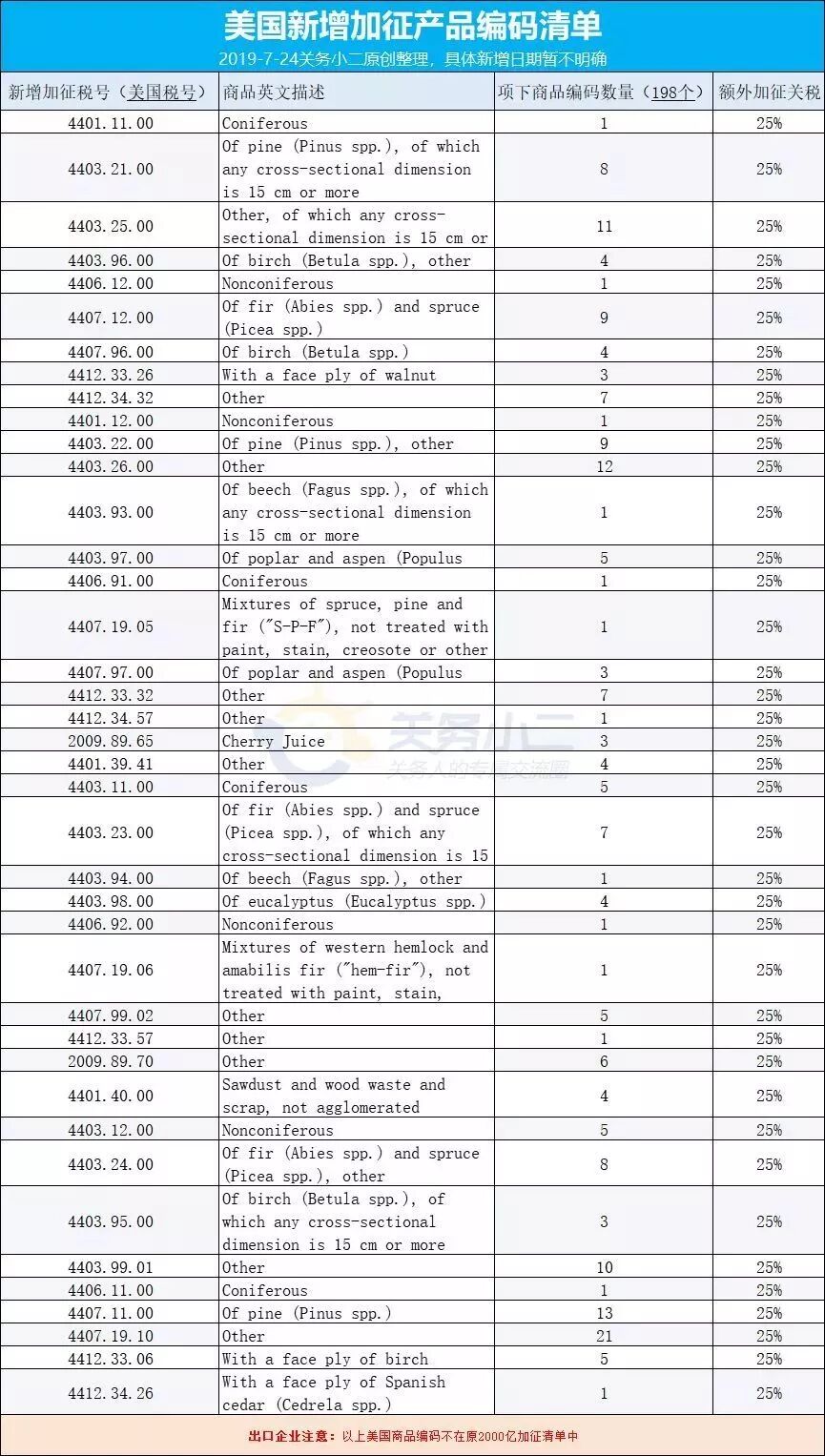 主要涉及产品:木及木制品196个编码、2209项下2个编码,预计原木及家具出口等,将受到较大影响。