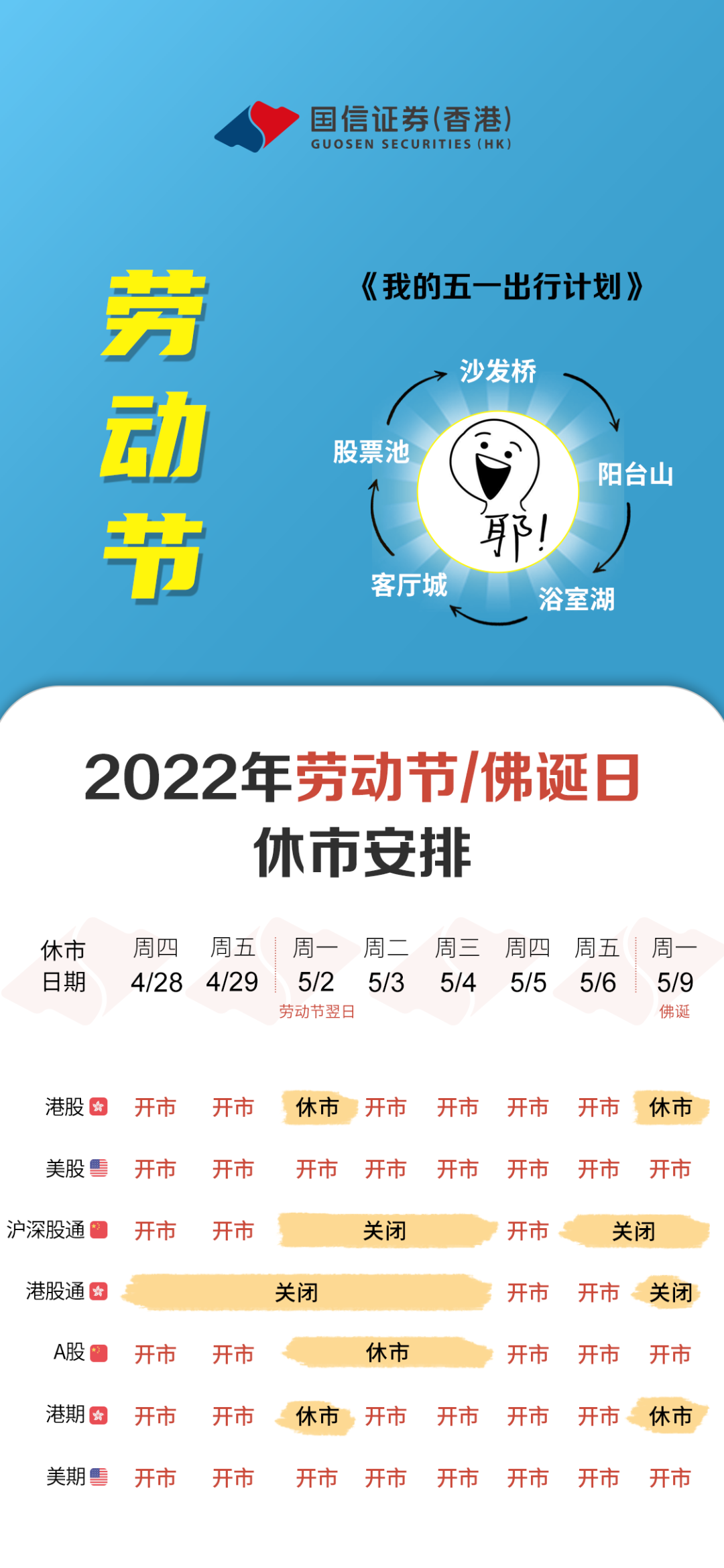 尊敬的投资者,五一节、佛诞节休市安排如下,敬请留意,并请提前做好交易和资金相关安排。