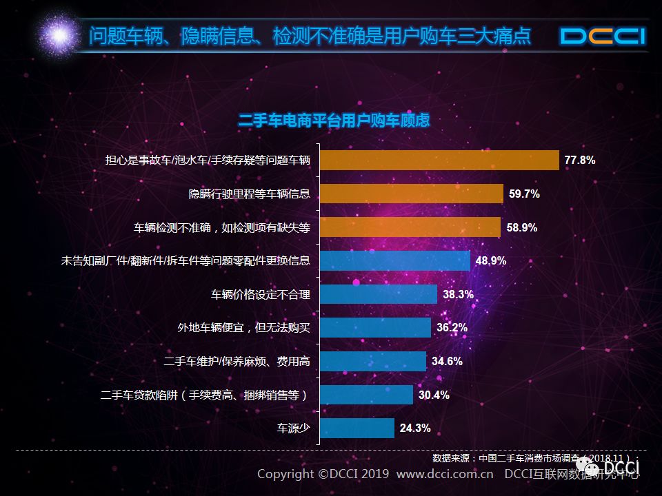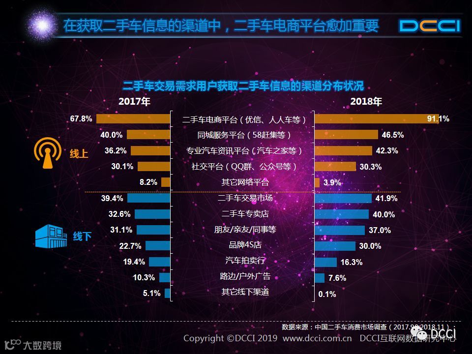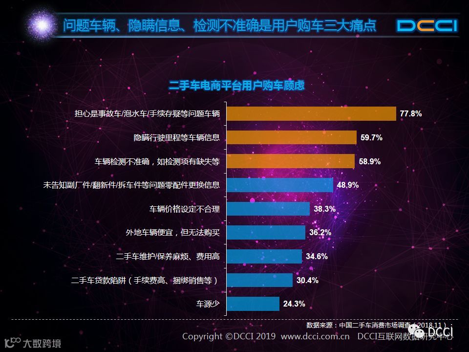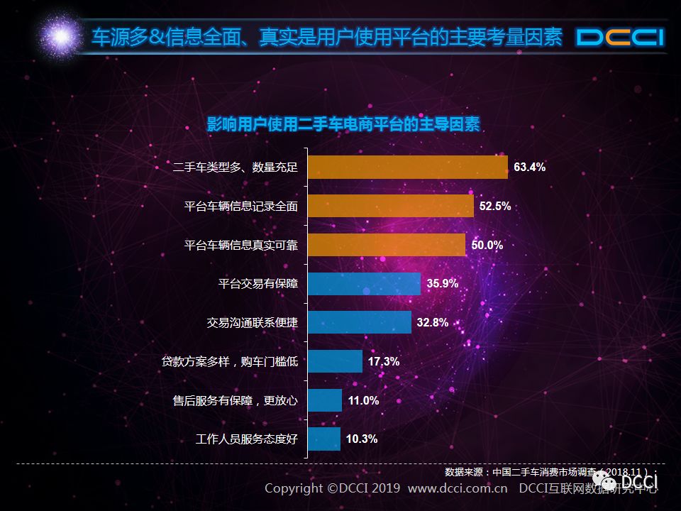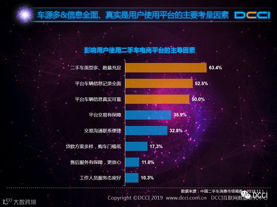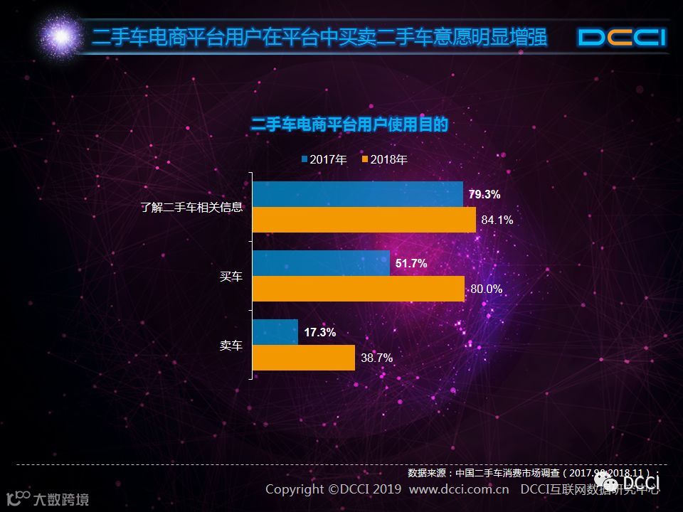 二手车市场中,在国家政策利好与二手车电商平台崛起的推动下,二手车销量增速较快,二手车市场在汽车市场中的影响力正在提升。在这样的背景下,DCCI发布《网络二手车交易用户体验研究报告(2018年终)》,其中研究发现: