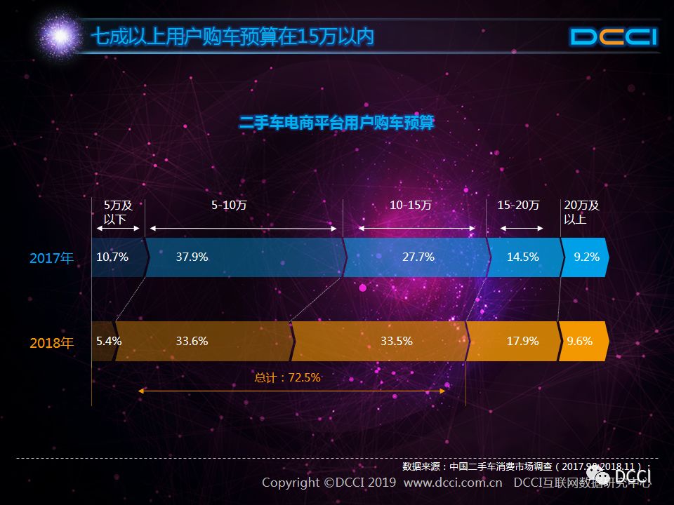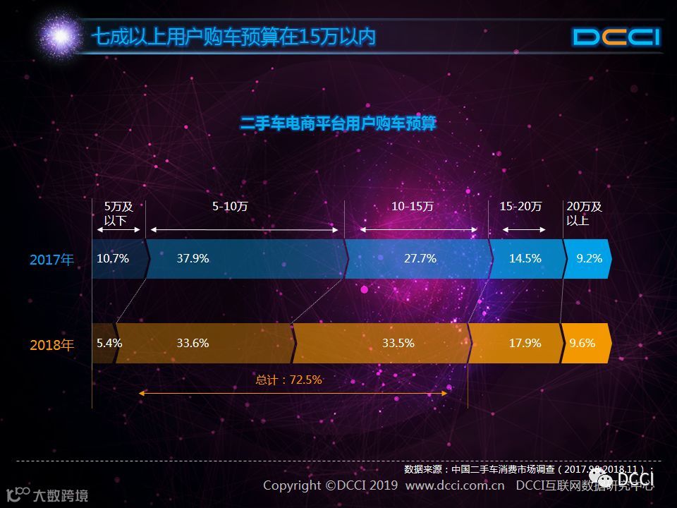 在二手车购买预算方面,用户购买二手车的预算正在提高。33.6%的用户购车预算为5-10万,33.5%的用户购车预算为10-15万,同时预算在15万以下的用户占比达72.5%。同时,相比2017年,2018年预算在5万以下的用户占比明显减少,预算为10-15万的用户明显增长。