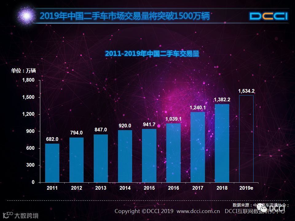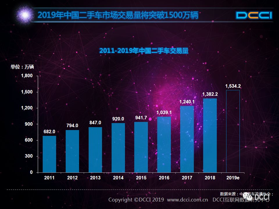 近年来中国二手车交易量稳定增长,2018年全年交易量达1382.2万辆,同比2017年增长11.5%。我国二手车市场还未完全成熟,在政府及市场推动下,2019年我国二手车交易量有望突破1500万辆。